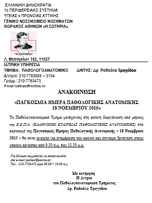 «ΠΑΓΚΟΣΜΙΑ ΗΜΕΡΑ ΠΑΘΟΛΟΓΙΚΗΣ ΑΝΑΤΟΜΙΚΗΣ 18 ΝΟΕΜΒΡΙΟΥ 2015»